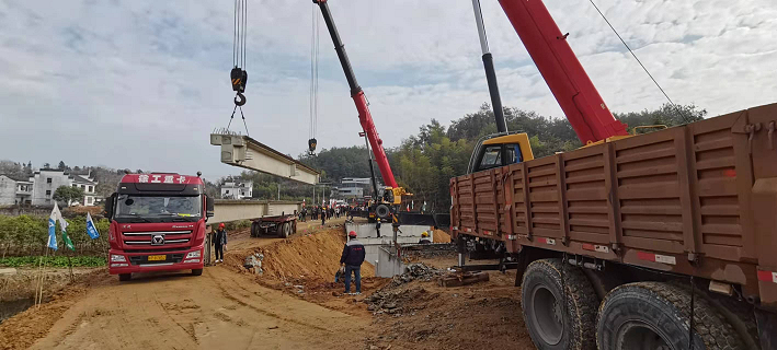 鮑家橋全長30.04米,橋梁全寬8.5m,凈寬7.5m,橋梁結構為1×20m預應力砼密肋式簡支T梁。為順利完成梁板吊裝作業(yè),公司精心組織,在梁板吊裝前認真做好安全技術交底、設置警戒區(qū)域等前期準備工作,在吊裝當日公司安全部前往施工現(xiàn)場監(jiān)督指導,確保安全施工,保障該橋梁主體工程順利完成。